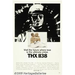 <B>THX 1138 (Warner Brothers, 1971)</B></I> One Sheet (27" X 41"). George Lucas' adaptation of his award-winning student film stars Robert Duvall and Maggie McOmie (in her only screen role) as roommates who fall in love in the sexless, drug-induced coma their future world has become. When THX (Duvall) is imprisoned for drug evasion and sexual crimes, he is determined to escape with his friend SEN 5241 (Donald Pleasence) and a hologram (Don Pedro Colley) and find the Pregnant LUH (McOmie). Lucas, who took the letters and numbers of the title character from his San Francisco telephone number, often referenced them in other of his films (a license plate number in "American Graffiti", a cell block number in "Star Wars"). This is the rarer one sheet that pictures Duvall and McOmie, as well as the policeman (played by Johnny Weissmuller, Jr.). Pinholes, very slight wrinkling and slight wear on the fold lines. Very Fine+.