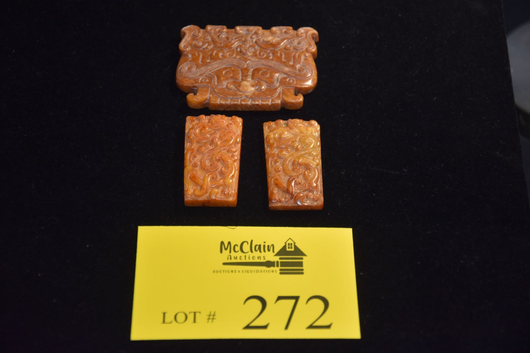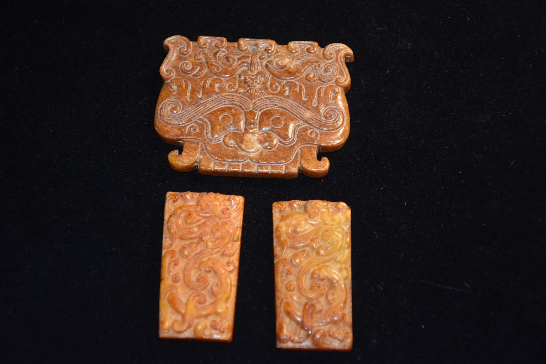 TIANHUANG CARVED DRAGON TABLETS (1 1/4" X 2 3/8") & TIANHUANG "TAOTIE" PLAQUE (3" X 2 3/8") (3 PCS)