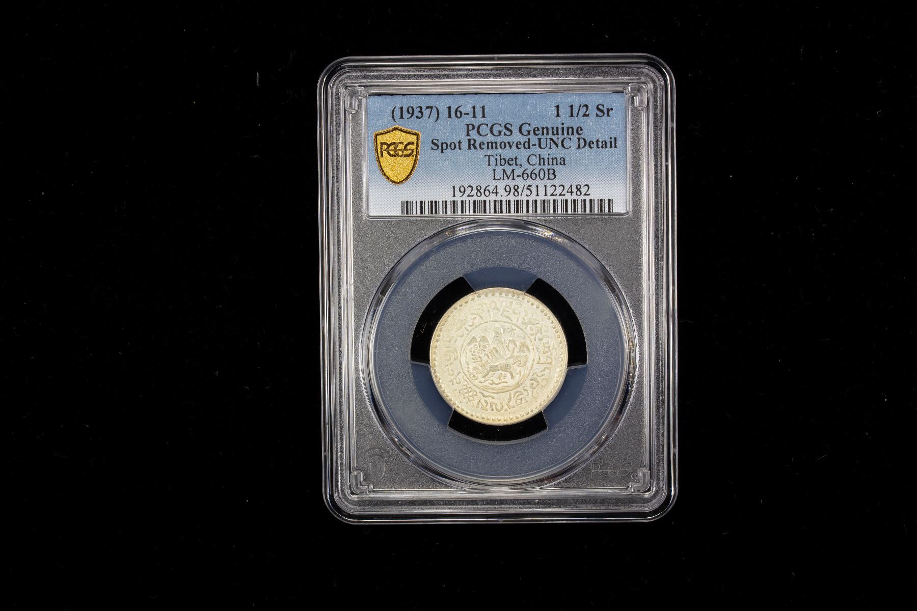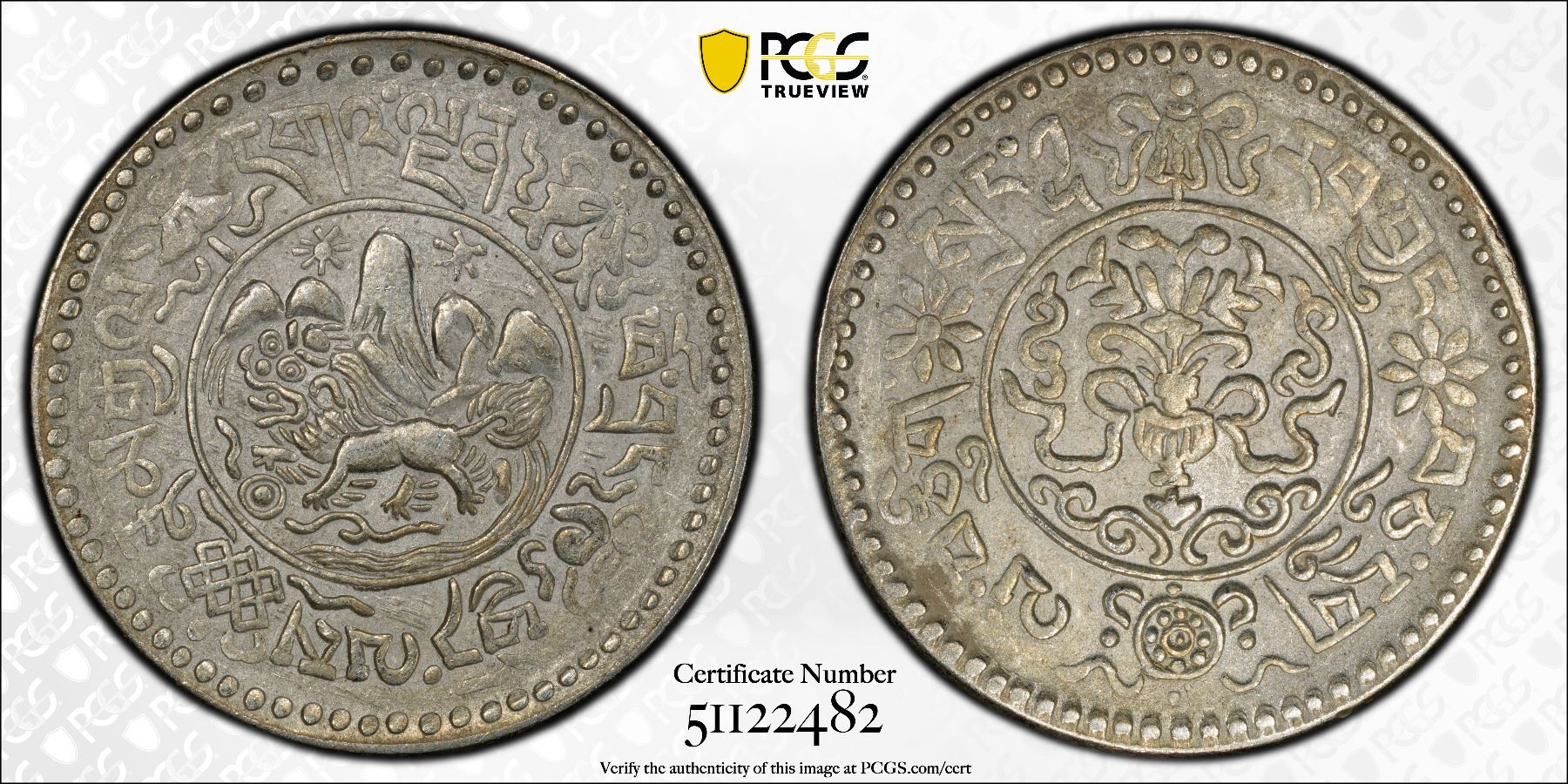 TIBET: AR 1½ srang, BE16-11 (1937), Y-24, L&M-660, Autonomous Tibetan issue, snow lion facing left in front of Mount Kailash with two suns in the background, sport removed, lustrous, PCGS graded UNC details.