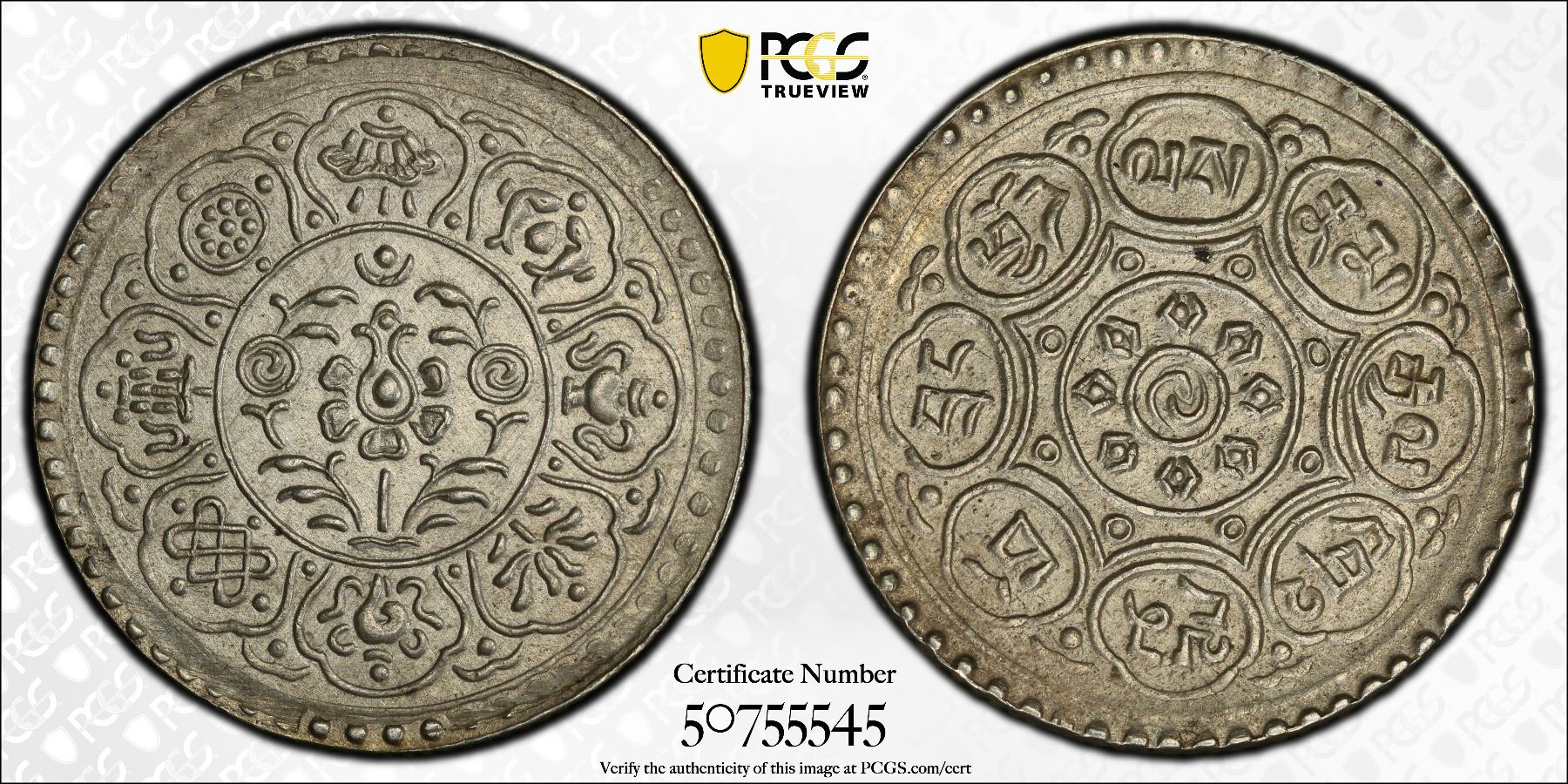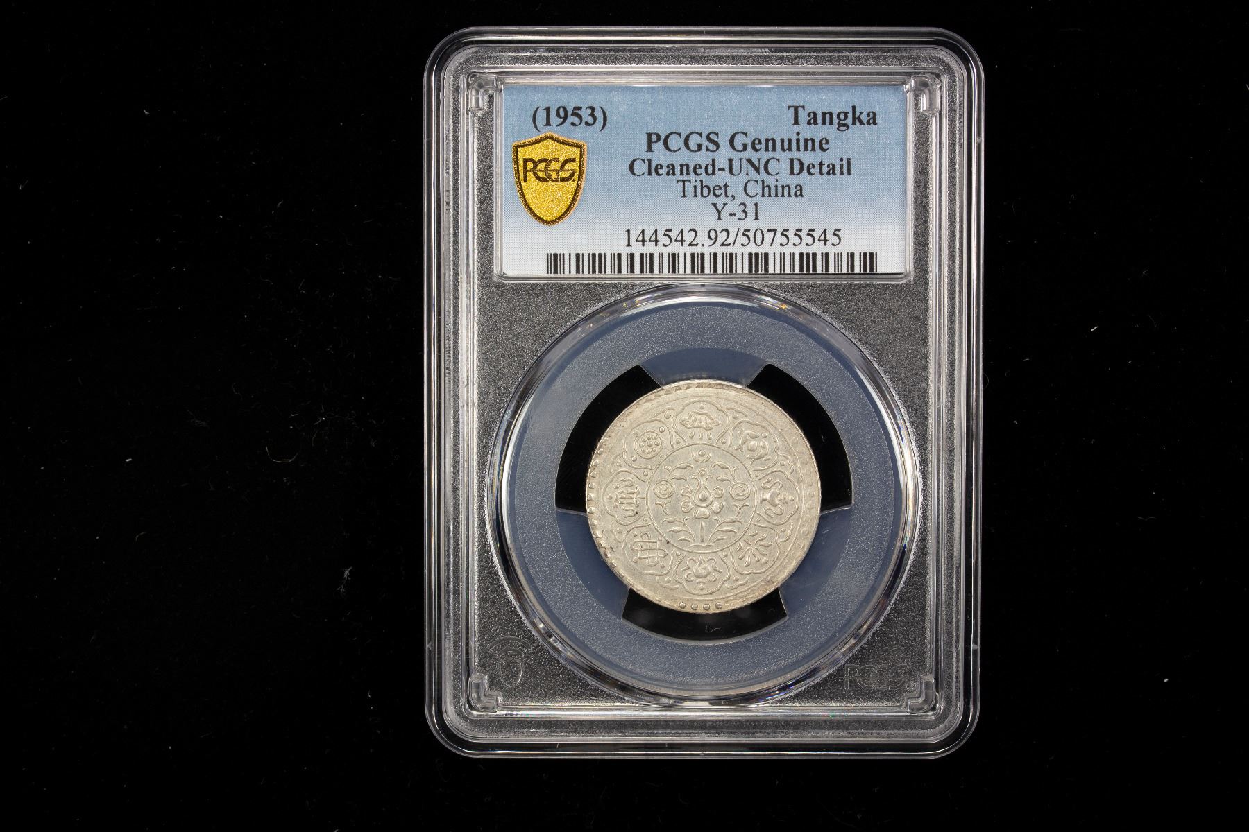 TIBET: AR tangka, ND (1953), Y-31, Second Monk issue, cleaned, PCGS graded UNC details. Formerly it was assumed that these tangkas were distributed to monks on behalf of the 14th Dalai Lama in the late 1940s. The Tibetans referred to this Tangka as Tangka dkarpo sa rpa ("new white tangka") in order to distinguish it from the normal ga-den tangkas. This coin circulated for some time at the value of 5 srang, which shows the high inflation rate which was prevailing in Tibet in the 20th Century. In the 19th Century 61/2 tangkas were equivalent to 1 srang which corresponded to slightly more than 37 grams of silver. Taking the circulating value of this "Monk" tangka as a base, 1 srang was equal to about 331/2 tangkas in 1953-54.