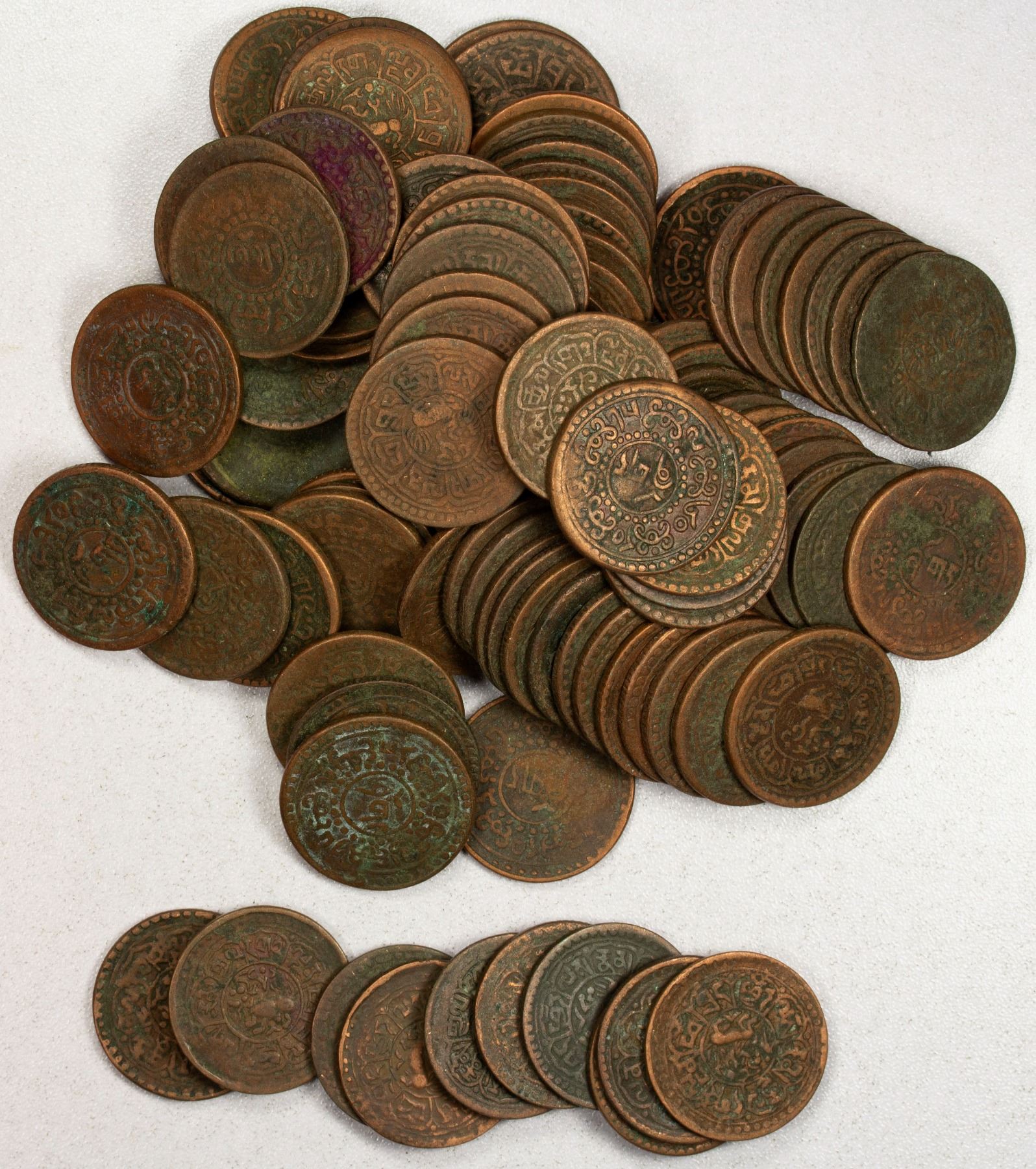 TIBET: LOT of 100 AE sho, most with horizontal legend except 10 with vertical legend; all in average circulated conditions, some VF, a few lightly bent; retail value $400, lot of 100 pieces.
