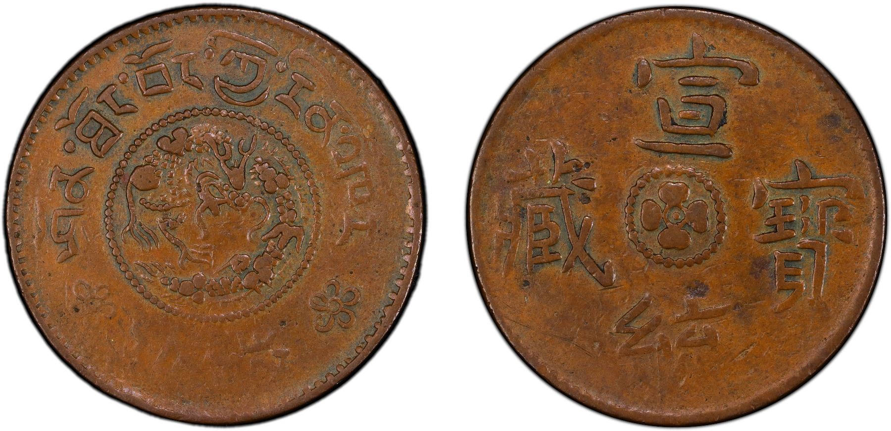 TIBET: Xuan Tong, 1909-1911, AE skar, ND (1910), Y-4, Sino-Tibetan issue, four-petalled lotus design at center, surrounded by a string of pearls, with Chinese inscription xuan tong bao zang // dragon at center, surrounded by a string of pearls, with Tibetan inscription shon thong bod kyi rin 'khor skar gang (Xuan Tong, precious coin of one skar), PCGS graded XF40, ex Charles W. Lueders III Collection.