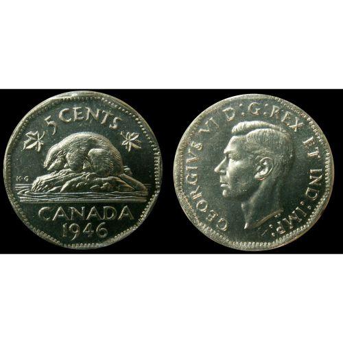 TIED FOR FINEST KNOWN! 1946 5¢ ICCS MS65 PQ+. Wow! An amazing "George Vi" Five cents. Excellent strike with clean fields and great surfaces. The nicest example ever handled by TCNC. Believed to be the nicest!