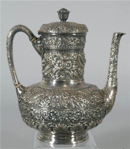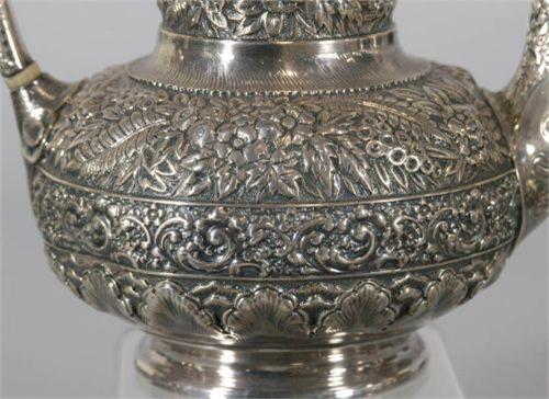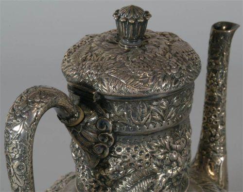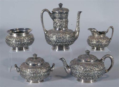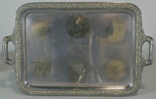 TIFFANY 5 PIECE STERLING TEA SET together with a matching Tiffany Silverplate Tray pattern 1982/order 2044 tray inscribed "Jessie Remington, from Mother and Father, December 1st, 1880" other pieces inscribed "Remington" on bottom, 2610 grams total weight excluding tray, CONDITION: various minor dents from use, small pot has loose handle and two dents in base rim, sugar with base dent, typical light scratches to tray. PACKING AND SHIPPING BY FAIRFIELD AUCTION WITHIN CONTINENTAL USA (excluding insurance) $75,