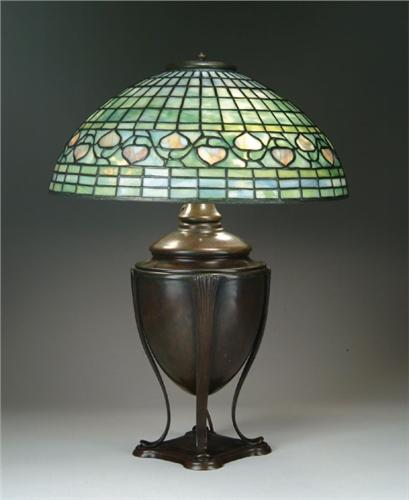 TIFFANY ACORN TABLE LAMP. Very nice Tiffany acorn has background glass of blue shading to green with center panel on apron showing blue as well. Acorns are done in nicely mottled and striated amber glass. Shade is signed with small tag "Tiffany Studios New York". Shade rests atop a four leg urn shaped base with three light cluster. Beautiful rich brown patina has nice green highlights. Base is marked on bottom of font insert "Tiffany Studios New York 888" and also carries the Tiffany Glass and Decorating Co. logo. SIZE: Shade is 16 in. dia. Overall height is 21-1/2 in. CONDITION: Very good to excellent with very few if any cracked panels. 5-61201