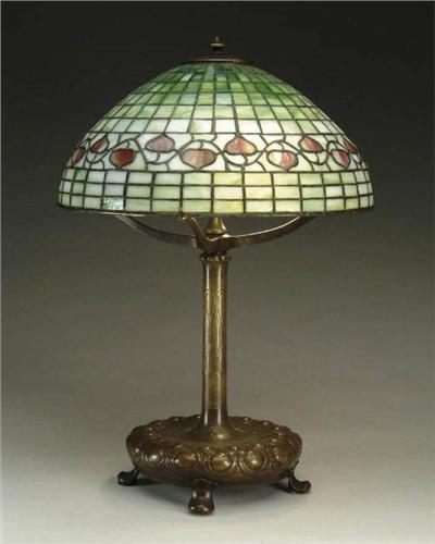 TIFFANY ACORN TABLE LAMP. Very nice Tiffany acorn shade has mottled green background panels with unique red acorns. Shade rests on a Tiffany bronze base with round pillow-shaped bottom with incised loop design on four attached feet. Bronze stem has matching design and leads to a three-arm spider to support the shade. Lamp is illuminated with a three-socket cluster. Shade is signed with small 1" tag "Tiffany Studios New York" while base is stamped "Tiffany Studios New York 25877" and also carries the Tiffany Glass & Decorating Co. logo. SIZE: Shade is 16" dia. Overall height is 22". CONDITION: Only a few tight hairlines in the shade. Some minor wear to patina on base. 5-62340