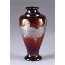 Lot 862 TIFFANY AMETHYST DECORATED VASE Unsigned Tiffany vase is amethyst glass with bronze iridescence and platinum pulled decoration. Prov.: Reportedly came from Barbara Streisand Collection. SIZE: 7” t. CONDITION: Vase has crack running across bottom of foot and up the vase approx. 2”. 5-71030