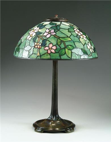 TIFFANY APPLE BLOSSOM TABLE LAMP. Very pretty Tiffany shade has lovely pink and red apple blossoms with dark green leaves set against a background of striated and mottled green. Tree branches are done in a lightly mottled opaque olive green. Shade is signed "Tiffany Studios New York". Shade rests on nice stick base with rich brown patina and three light cluster. Base is stamped "Tiffany Studios New York 533". SIZE: Shade is 16 in. dia. Overall height is 21-3/4 in. CONDITION: Some cracked panels, all are tight and intact. Otherwise, very good. 5-60994