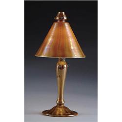 Lot 567 TIFFANY ARABIAN LAMP All glass lamp, heavily decorated with gold and platinum snakeskin design on a butterscotch ground. Shade is signed “LCT”, base is signed “L.C. Tiffany Favrile”. SIZE: 13” t. CONDITION: Shade is good, harp on base has been reattached. 5-70679