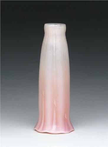 TIFFANY ART GLASS LILY SHADE. Wonderful pastel pink Tiffany lily shade with slight vertical ribbing and white interior lining. Signed "L.C.T." around fitter. SIZE: 5-1/4 in. t. CONDITION: Very good to excellent. Estate of Jon Heiden and Donald Mooers 5-60664-1232