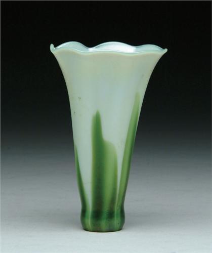 TIFFANY ART GLASS LILY SHADE. Cream colored Tiffany lily shade has iridescent green decoration. Signed "L.C.T." SIZE: 4-1/2 in. t. CONDITION: Slight crack around fitter, otherwise very good to excellent. Estate of Jon Heiden and Donald Mooers 5-60664-1230