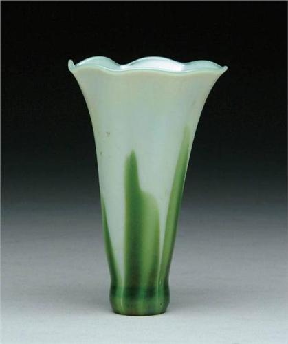 TIFFANY ART GLASS LILY SHADE. Cream colored Tiffany lily shade has iridescent green decoration. Signed "L.C.T." SIZE: 4-1/2" t. CONDITION: Slight crack around fitter, otherwise very good to excellent. Estate of Jon Heiden & Donald Mooers 5-60664-1230