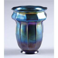 Lot 200 TIFFANY BLUE ART GLASS SHADE R#125. Tiffany blue art glass shade, nicely ribbed with double apron. Unsigned. SIZE: 2-1/4” fitter x 5-1/2” t. CONDITION: Very good to excellent. 5-70446