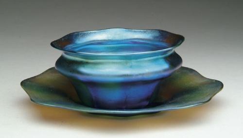 TIFFANY BOWL AND PLATE. Tiffany fingerbowl and underplate has rich blue iridescence with strong flashes of purple and gold. Bowl is signed "LCT J589". Plate is signed "LCT J595". SIZE: Plate: 6-1/2 in. dia. Bowl: 4-1/4 in. dia. CONDITION: Very good to excellent. Collection of Dr. C. and Margaret Chastain 5-61548