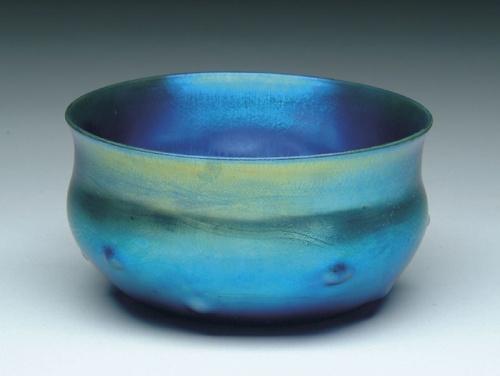 TIFFANY BOWL. Wonderful Tiffany bowl has rich peacock blue iridescence with gold and green highlights to upper half of exterior. Exterior of bowl is decorated with random knobs. Signed on the underside "LCT". SIZE: 4-1/2 in. dia. CONDITION: Very good to excellent. 5-61176