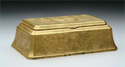 TIFFANY BRONZE BOX. Beautiful Chinese pattern Tiffany box has bright gold patina and is lined on the interior with cedar. Signed on the underside "Tiffany Studios New York 1773". SIZE: 5-1/4 in. x 8 in. CONDITION: Minor discoloration to patina, otherwise very good to excellent. 5-61326