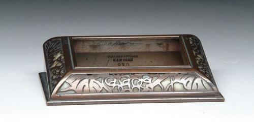 TIFFANY CALENDAR FRAME. Nice desk top calendar frame has openwork grapevine pattern with curved panels of carmel slag glass behind. Signed on the underside "Tiffany Studios New York 930". SIZE: 4-1/2 in. x 3-1/2 in. CONDITION: Missing back and clip that hold calendar in place, otherwise very good. 5-61161