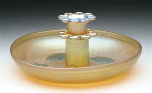 TIFFANY CENTER BOWL. Very nice Tiffany center bowl has lovely gold iridescence with stretched sides and leaf and vine decoration in the bottom. Bowl is topped with gold favrile flower frog with nice gold iridescence and bright flashes of rich blue. Bowl is signed on the underside "LC Tiffany Favrile 3563L". Frog is signed "LC Tiffany Favrile 5842N". SIZE: 11 in. dia. CONDITION: Very good to excellent. 5-61328