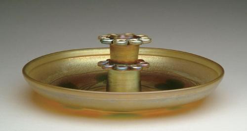 TIFFANY CENTERBOWL. Wonderful Tiffany centerpiece has rich gold iridescence with green leaf and vine decoration around bottom of bowl. Bowl is complete with flower frog insert in matching gold iridescence. Bowl is signed on underside "1177L L.C. Tiffany - Favrile". Frog is signed "LC Tiffany Favrile 1177L". SIZE: 12 in. dia. CONDITION: Some minor chips to rim that holds flower frog, otherwise very good to excellent. Collection of Dr. C. and Margaret Chastain 5-61385