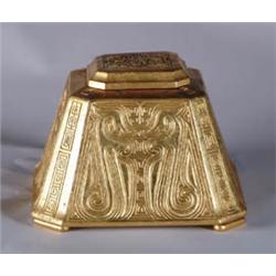 Lot 841 TIFFANY CHINESE INKWELL Very nice Tiffany inkwell is done in the Chinese pattern with bright gold dore finish. Inkwell has original glass insert. Signed on bottom "Tiffany Studios New York 1753". SIZE: 6-1/2" sq x 4-3/4" t. CONDITION: Very minor wear to finish, otherwise very good to excellent. 5-71038