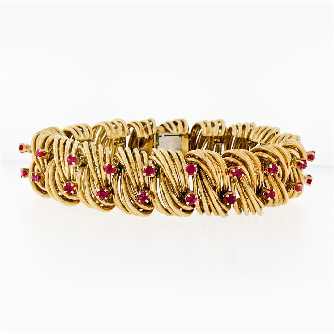 One Vintage Handmade 100% Guaranteed Authentic TIFFANY & CO. 18k Gold Wire 3.60ctw Fine Round Ruby Statement Bracelet. Item Details - Material: Solid 18k Yellow Gold, Weight: 93.85 Grams, Stone(s): (36) Natural Genuine Rubies - Round Brilliant Cut - Prong Set - Rich Blood Red Color, Total Carat Weight: 3.60 (approx.), Type: Handmade and Assembled Overlapping Wire Link, Length: Comfortably Fits Up To a 6 Inch Wrist, Clasp: Large and Sturdy Box Clasp, Width: Approximately 17.5mm, Thickness: Approximately 9.0mm (at the rubies), Signature: 18k Tiffany & Co., Condition: Vintage, 100% authentic, Tiffany & Co. bracelet w/ original finish and patina preserved. Excellent condition and ready to wear.