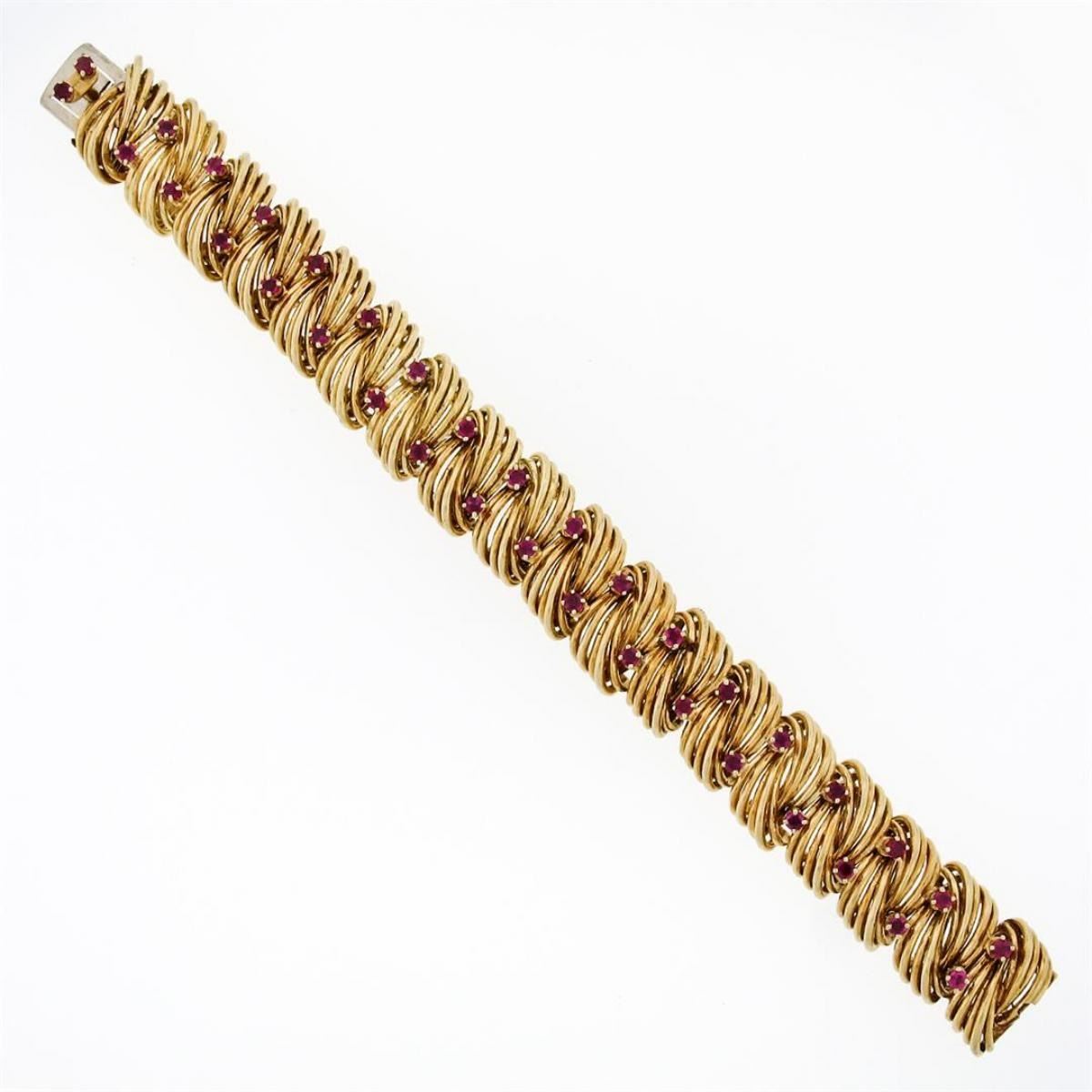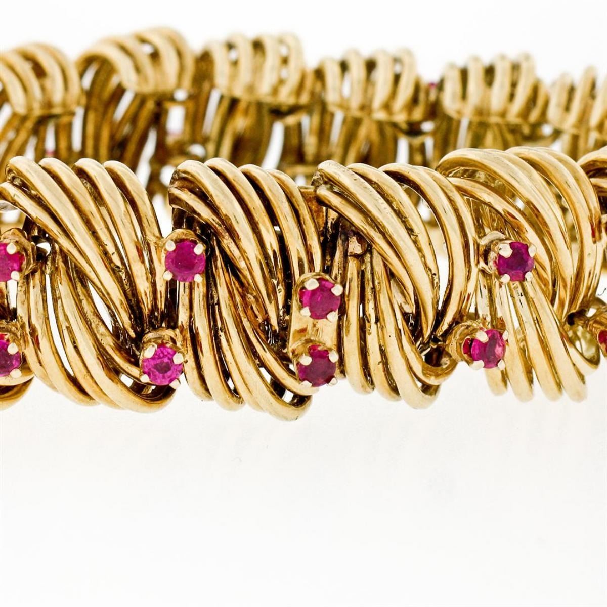 One Vintage Handmade 100% Guaranteed Authentic TIFFANY & CO. 18k Gold Wire 3.60ctw Fine Round Ruby Statement Bracelet. Item Details - Material: Solid 18k Yellow Gold, Weight: 93.85 Grams, Stone(s): (36) Natural Genuine Rubies - Round Brilliant Cut - Prong Set - Rich Blood Red Color, Total Carat Weight: 3.60 (approx.), Type: Handmade and Assembled Overlapping Wire Link, Length: Comfortably Fits Up To a 6 Inch Wrist, Clasp: Large and Sturdy Box Clasp, Width: Approximately 17.5mm, Thickness: Approximately 9.0mm (at the rubies), Signature: 18k Tiffany & Co., Condition: Vintage, 100% authentic, Tiffany & Co. bracelet w/ original finish and patina preserved. Excellent condition and ready to wear.
