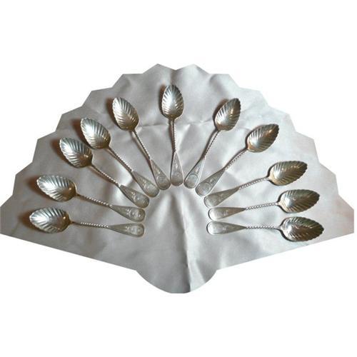12 pieces Tiffany & Co. berry spoon with a twist stem and serrated bowl. The pattern has not been identified; however, the pieces are circa 1880. The pattern is similar to the ?Ivy? pattern, except it features a geometric ribbon. The spoons are 5-1/2? long and weigh 6.8 ounces. The bowl is 1-15/16? long X 1-1/8? wide. The twist is 1-1/2? long. All 12 pieces are monogrammed with ?CP? in old English lettering. They are in very good used condition and each piece is clearly marked ?Tiffany & Co.? and ?STERLING?.