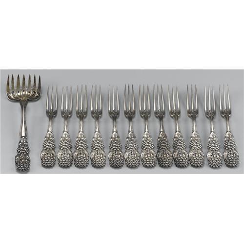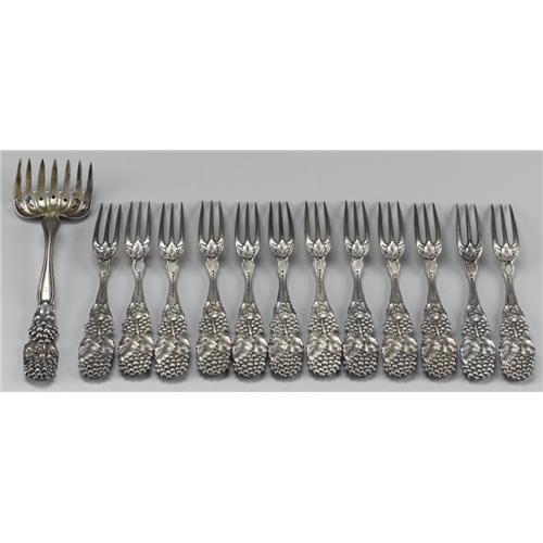 <B>SET OF DESSERT FORKS</B></I><BR>Tiffany & Co.<BR><BR>Set includes twelve dessert forks together with one serving fork, all with grape and leaf design to handles, and marked <I>Tiffany & Co. Sterling</B></I><BR>Each approximately 4-1/4in. long<BR><BR> <B>Condition Report:</B> Normal signs of wear as appropriate with age.<BR><BR><b>Shipping:</b> Hollowware/Pottery/Glass, Small (<a target="_blank" href="http://www.heritageauctions.com/common/shipping.php">view shipping information</a>)