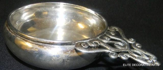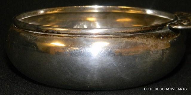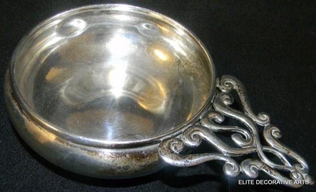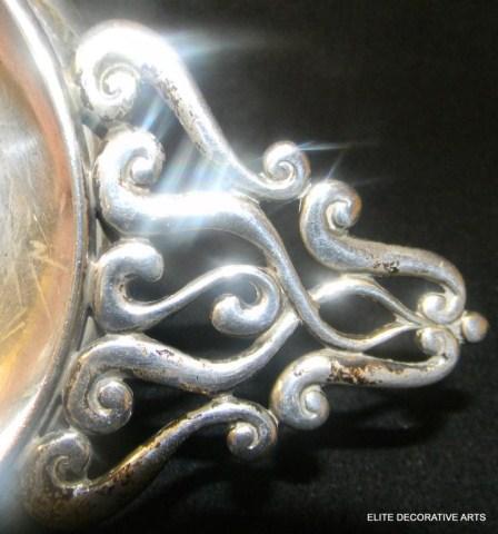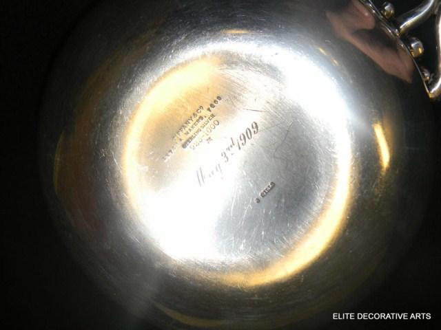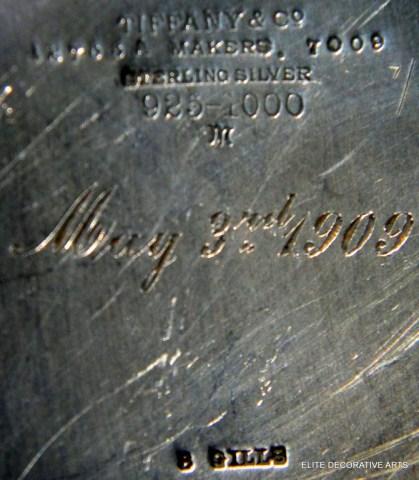 Has a scroll design pierced handle. Has a monogram to front. Tiffany makers mark to bottom. Marked with the number 12733A 7009. Dated May 3, 1909. B. Gills Impressed marked on bottom. Measures 1 3/4" h X 7 1/8" l X 5 1/4" w.