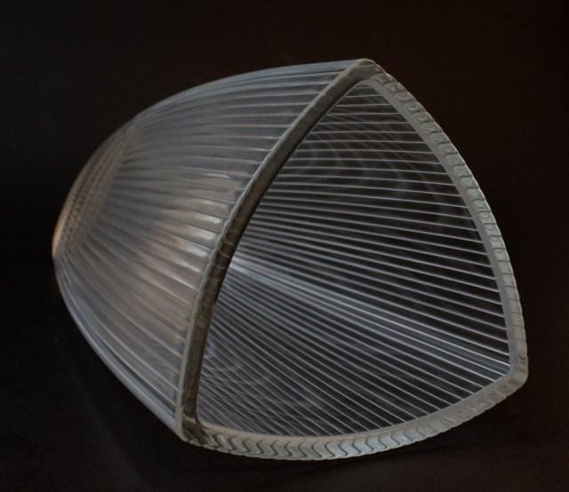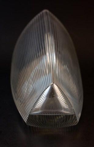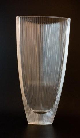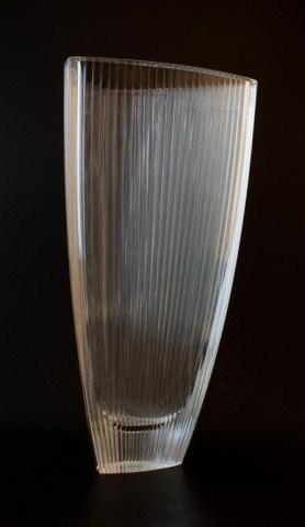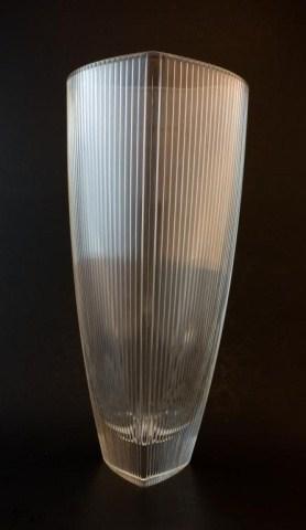 Has triangular shape and etched vertical line design. Tiffany & Company watermark to bottom. Measures 10" h.