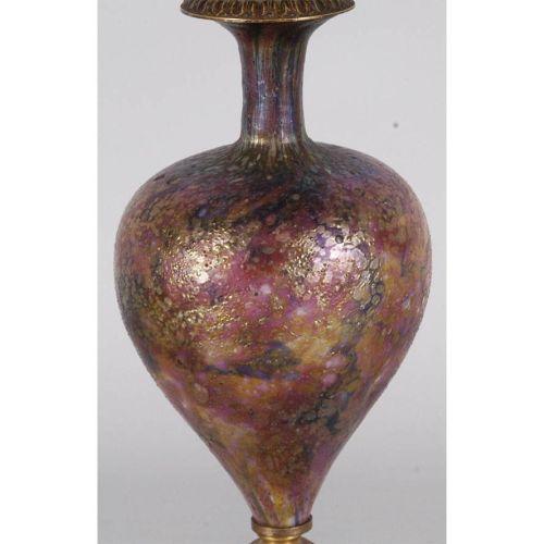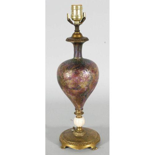 TIFFANY CYPRIOTE LAMP BASE, mounted as a lamp on a dore base (by Cassidy, New York), the glass 13" high, signed, "Louis C. Tiffany Favrile", circa 1910, no shade. CONDITION REPORT: no problems. PACKING AND SHIPPING: We offer packing (double boxed in most cases) and shipping of this item within the Continental United States by USPS or UPS (our choice- boxes over 30lbs or oversized may be recalculated based on buyer's location), NOT INCLUDING INSURANCE (it will be added when we know the sales price) for $30