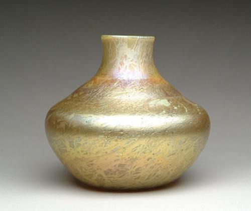 TIFFANY CYPRIOTE VASE. Rare Tiffany Cypriote vase has gold iridescence with flashes or purple and green. Signed on the underside "LCT". SIZE: 7-1/2 in. t x 8 in. dia. CONDITION: Very good to excellent. Collection of Dr. C. and Margaret Chastain 5-61414