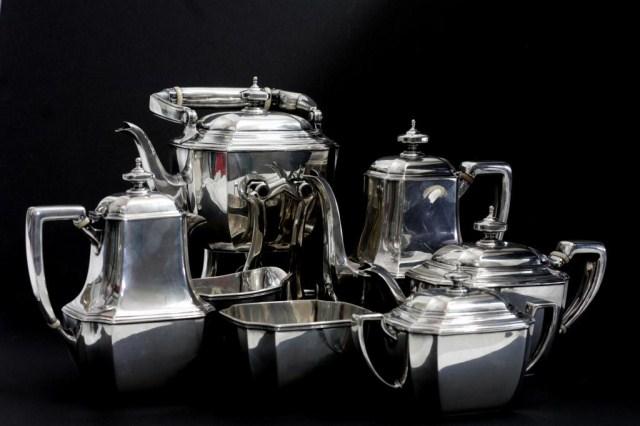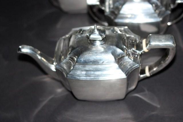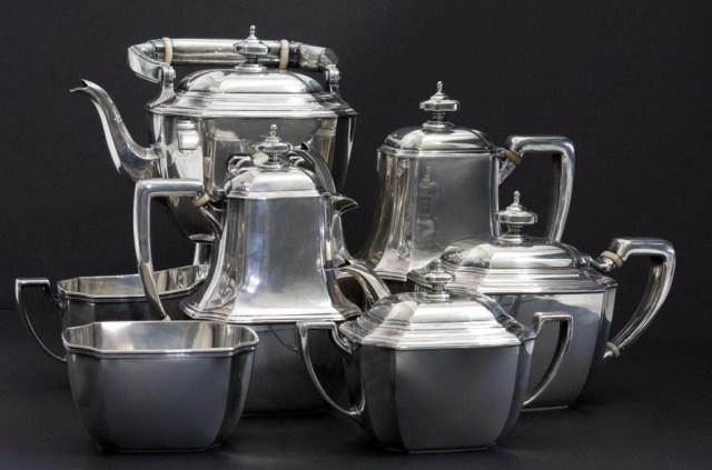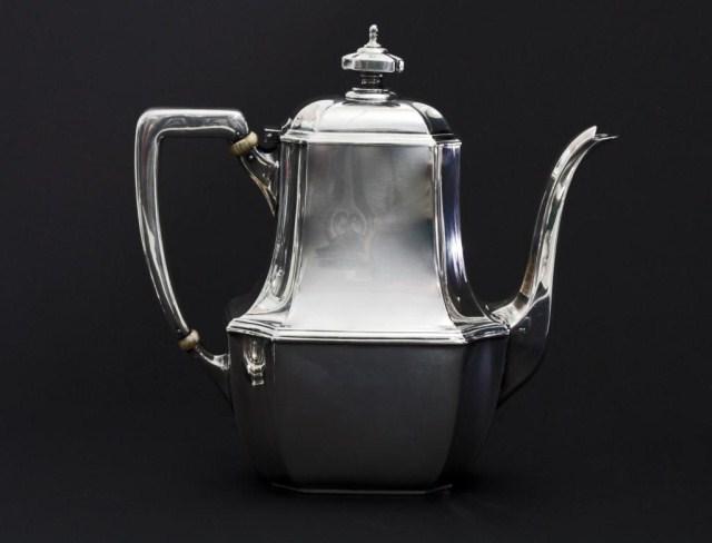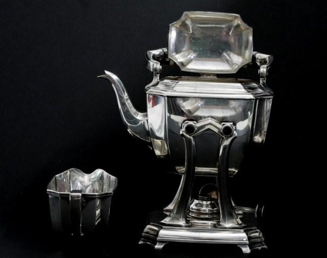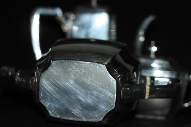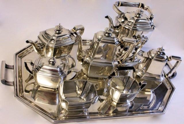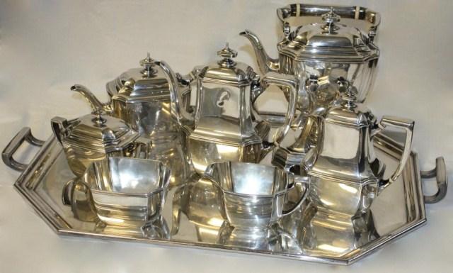 Amazing hollowware set in the Hampton pattern by Tiffany & Company. Pattern #18389. Set includes Kettle with heating stand 12" height. Coffee pot 8 1/2" height. Teapot 5 1/2" height. Hot chocolate 7 1/2" height. Covered sugar 4 3/4" height. Creamer 3"height. Waste bowl 2 3/4" height. ***Please note that the tray is not Tiffany and is silver plate.***