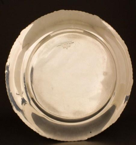 Beautiful sterling silver Tiffany & Co round plate. Has a beaded edge design. Has Tiffany marks on bottom. Marked 17877 1385. Made circa 1920. Measures 9 3/4" diameter.