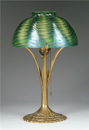 TIFFANY DAMASCENE DESK LAMP. Wonderful Tiffany desk lamp has green favrile damascene shade with blue, purple and gold iridescent highlights. Shade is cased with white glass. Interior white casing has two random threads of glass on either side of interior. Shade rests atop a three-arm single socket base with artichoke foot in gold patina. Lamp comes with Tiffany top cap with a brown patina finish. Shade is signed "LCT" at top rim and base is signed "Tiffany Studios New York 445". SIZE: Shade is 9-3/4 in. dia. Overall height is 16 in. CONDITION: Very good to excellent. Estate of Jon Heiden and Donald Mooers 5-70456