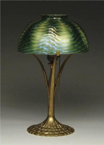 TIFFANY DAMASCENE DESK LAMP. Wonderful Tiffany desk lamp has damascene shade in green iridescent with rich blue and gold iridescent wavy lines. The shade has nice vertical ribbing and a white cased interior. Shade rests on three-arm single-socket three-arm base with artichoke foot and gold patina. Shade is signed "L.C.T." while base is stamped "Tiffany Studios New York 445". SIZE: Shade is 10" dia. Overall height is 16-1/2". CONDITION: Inside of shade has some random threads, one of which is partially chipped away. Base has replaced socket and minor wear to patina. Estate of Jon Heiden & Donald Mooers. 5-70456