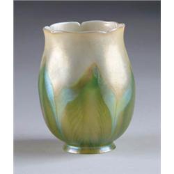 Lot 223 TIFFANY DECORATED ART GLASS SHADE Green pulled feather clambroth iridescent ground. Signed “LCT”. CONDITION: Minor chip to fitter rim. 5-70699
