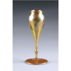 Lot 512 TIFFANY DECORATED FLOWER FORM Rare diminutive sized gold Favrile glass decorated with green hearts and vines. Signed “7198D L.C. Tiffany Favrile”. SIZE: 6” t. CONDITION: Slight staining to interior, otherwise very good. 5-70510