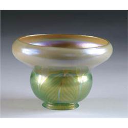 Lot 177 TIFFANY DECORATED SHADE Green pulled feather decoration on clam broth with platinum luster in bell shape. Signed “LCT”. SIZE: 2-1/4” fitter x 4-1/2” t x 5-1/2” w. CONDITION: Minor chips to fitter rim. Very nice shape. 5-70422