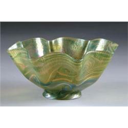 Lot 189 TIFFANY DECORATED SHADE Candlestick shade; multi-shaded green ground decorated with King Tut decoration in gold with platinum iridescent highlight. Signed “LCT”. SIZE: 2-1/2” fitter x 3-7/8” t x 7-1/4” w. CONDITION: Minute imperfections in making. 5-70435