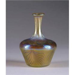 Lot 562 TIFFANY DECORATED VASE Gold iridescent squat vase with lower portion having a pulled design and the upper portion having a wavy pattern and petals emanating from the slender neck with all over purple highlights. Signed on the underside with a questionable “LCT B382” as well as an original Tiffany paper label in the center. SIZE: 4-1/4” t. CONDITION: Very good to excellent. 5-70952
