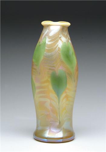 TIFFANY DECORATED VASE. Extremely nice Tiffany vase has wonderful green pulled heart design against a gold, yellow and silver iridescent background. Signed on the underside "LCT 2566A". SIZE: 11-1/4 in. t. CONDITION: Very good to excellent. 5-61474