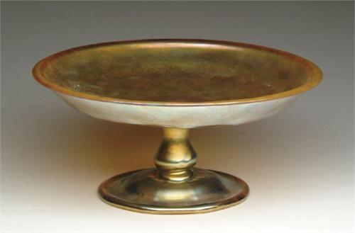 TIFFANY FAVRILE COMPOTE. Very nice Tiffany compote has applied ribbed foot with low standard and applied bowl with slight d.q. design. The subtle gold iridescence has flashes of platinum, pink and blue. Signed on the underside "LCT Favrile". SIZE: 8 in. dia. CONDITION: Very good to excellent. Collection of Dr. C. and Margaret Chastain 5-61410