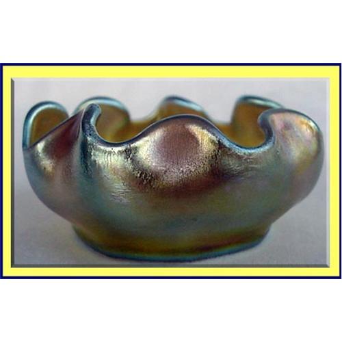 Louis Comfort Tiffany signed favrile glass open salt. Made about 1900.<BR>Measures a little over 2 1/2inches accross and slightly more than 1/1/4inch high (depending on where you measure since the bowl is ruffled).<BR>Ruffle edged round bowl. Great buttery smoothe iridescence all over - colours range from silver to gold and pick up and reflect every surrounding shade. <BR>Engraved L.C.T signature and very finely engraved N-0.<BR>Condition very good with no chips/cracks/restorations. The small dark marks magnified in the 'photos might be ink/colour where something rubbed against the glass.