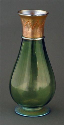 TIFFANY FAVRILE TEL EL AMARNA VASE iridescent gold collar with Egyptian chain decoration, green transparent crystal body, blue iridescent foot, paper label, signed "L.C. Tiffany Favrile", numbered 3898J, 9 1/2" high