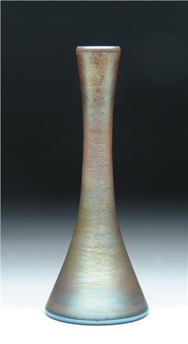 TIFFANY FAVRILE VASE. Fine Tiffany vase has platinum gold iridescence with blue highlights. Signed on the underside "LC Tiffany – Favrile X75". SIZE: 8 in. t. CONDITION: Very good to excellent. 5-61178