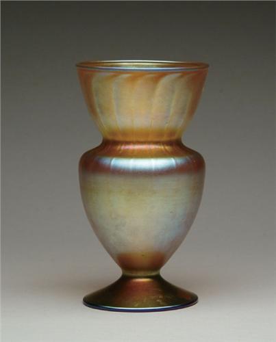 TIFFANY FAVRILE VASE. Lovely Tiffany vase has ribbed waisted body with rich gold iridescence showing flashes of green and blue. Signed on the underside "LC Tiffany Inc Favrile 1886N" over an "I". SIZE: 8 in. t. CONDITION: Very good to excellent. Collection of Dr. C. and Margaret Chastain 5-61382
