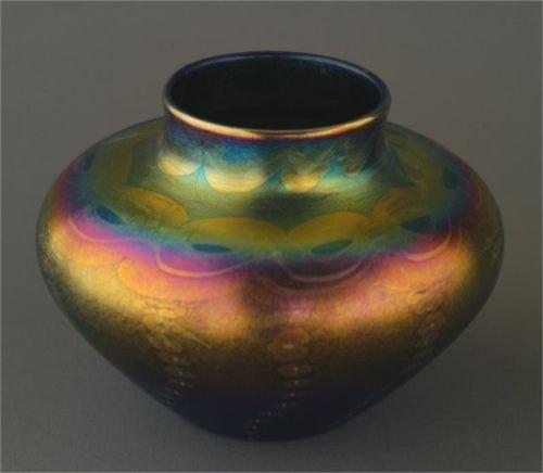 TIFFANY FAVRILE VASE squat urn form, black/blue with gold decoration, signed "LCT" and numbered "K19(8)33", 4 1/4" high