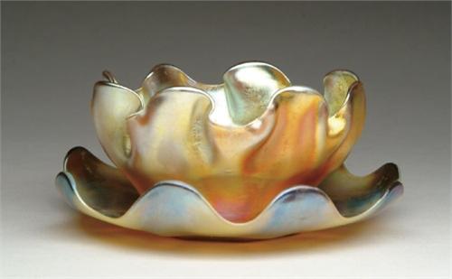 TIFFANY FINGERBOWL AND PLATE. Gorgeous Tiffany fingerbowl and underplate has bright gold iridescence with flashes of rich blue and purple at the points of the underplate. Signed on the underside "LCT". SIZE: Plate: 6-1/4 in. dia. CONDITION: Very good to excellent. Collection of Dr. C. and Margaret Chastain 5-61413