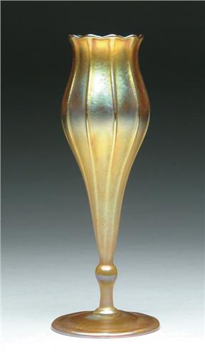 TIFFANY FLOWER FORM VASE. Nice gold iridescent flower form vase has ribbed exterior with fuschia and green highlights at the base. Signed "LC Tiffany Favrile Inc. 1524". SIZE: 9 in. t. CONDITION: Very good to excellent. 5-60814
